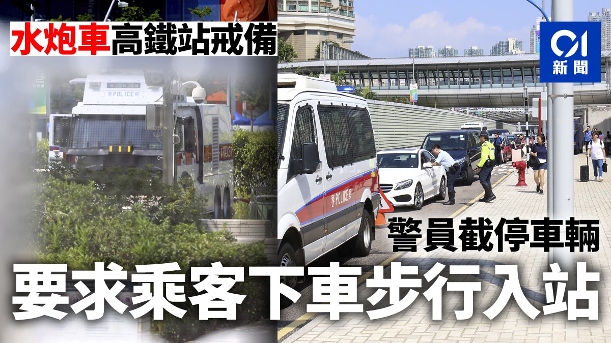 今早西九高鐵站已被大量水馬圍封,有高鐵站職員表示今天只開放一個出入口;另外,有警員於的士落客處對外馬路截停車輛,要求乘客下車步行至入口。此外,約十輛警車於及大量防暴警員於高鐵站內,而水炮車亦現身上址戒備。